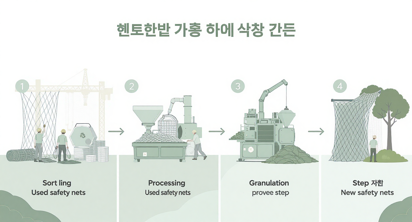 安全網在工地分類,送至GRS認證工廠加工,製成塑膠粒,循環製造新網。自動化技術確保⾼效透明,符合永續發展標準,提升ESG價值。